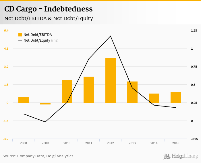 CD Cargo's net debt stood at CZK 1,294 mil and accounted for 0.179 of equity at the end of 2015. The ratio is down 0.033 pp compared to the previous year.