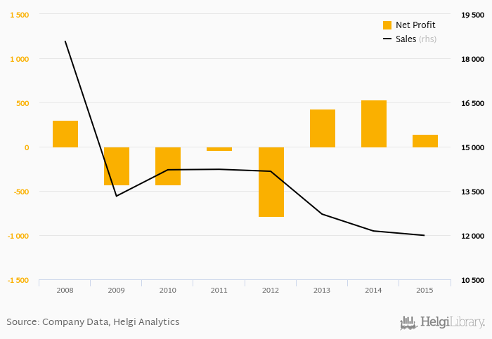 Sales have fallen by 3.35% a year on average since 2010. They reached a high of CZK 18,590 mil in 2008 and a low of CZK 11,990 mil in 2015.