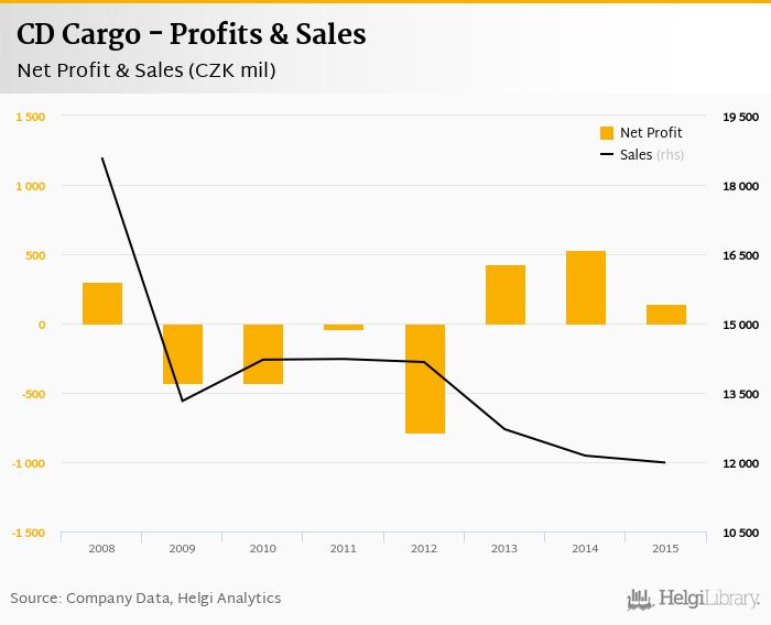 CD Cargo made a net profit of CZK 140 mil in 2015, down 73.9% compared to the previous year. Total sales reached CZK 11,990 mil, which is down 1.24% when compared to the previous year.