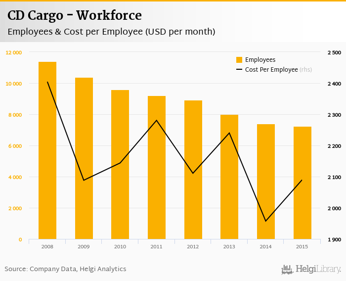 CD Cargo employed 7,249 employees in 2015, down 1.99% compared to the previous year. Historically, between 2008 and 2015, the firm's workforce hit a high of 11,394 employees in 2008 and a low of 7,249 employees in 2015.
