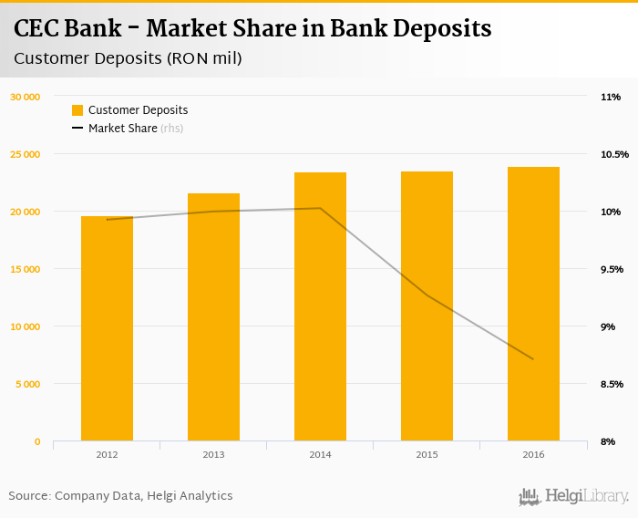 CEC Bank accounted for 8.70% of all customer deposits taken by banks in Romania at the end of 2016. Historically, the bank’s market share in customer deposits reached an all time high of 10.0% in 2014 and an all time low of 8.70% in 2016.