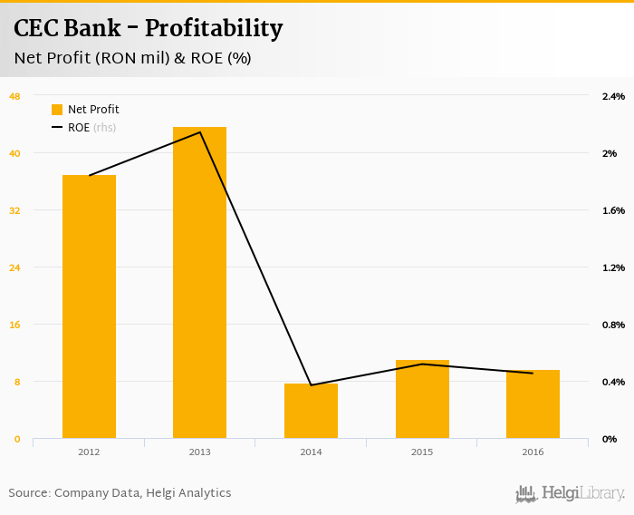 CEC Bank made a net profit of RON 9.60 mil in 2016, down 12.7% compared to the previous year. This implies a return on equity of 0.453%.