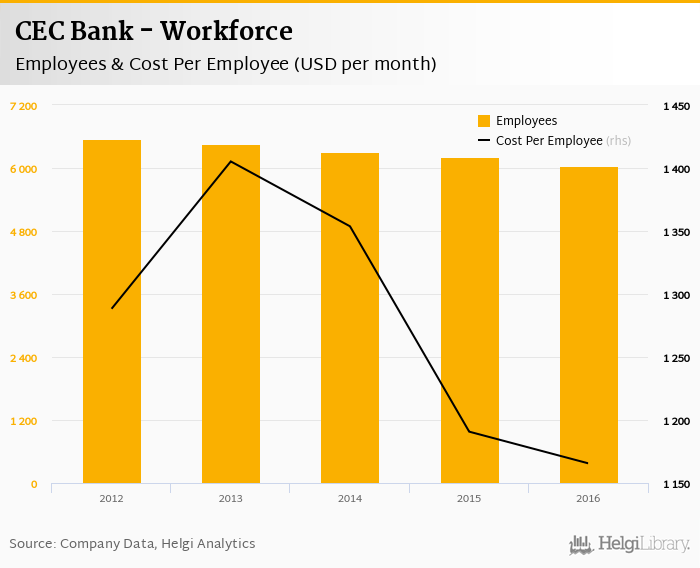 CEC Bank employed 6,039 persons in 2016, down 2.77% when compared to the previous year. Historically, the bank's workforce hit an all time high of 6,548 persons in 2012 and an all time low of 6,039 in 2016.