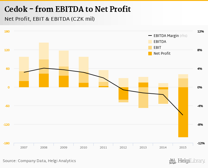 Cedok made a net profit of CZK -161 mil with revenues of CZK 1,962 mil in 2015, down by 2% and down by 20.9%, respectively, compared to the previous year. This translates into a net margin of -8.18%.
