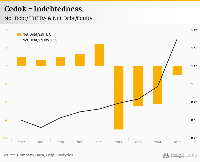 Cedok's net debt stood at CZK 183 mil and accounted for 1.63 of equity at the end of 2015. The ratio is up 0.663 pp compared to the previous year.