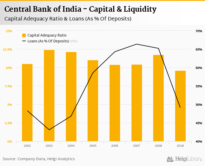 Central Bank of India's capital adequacy ratio reached 9.61% at the end of 2018, up from compared to the previous year. Historically, the bank’s capital ratio hit an all time high of 12.4% in 2003 and an all time low of 9.61% in 2018.