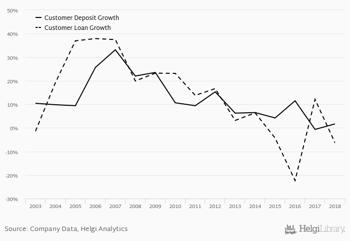 On the other hand, bank's customer deposit growth amounted to 1.68% at the end of 2018, up from -0.657% when compared to the previous year. Historically, the bank’s deposit growth reached an all time high of 33.1% in 2007 and an all time low of -0.657% in 2017. In the last decade, the average annual loan growth amounted to 8.63%.