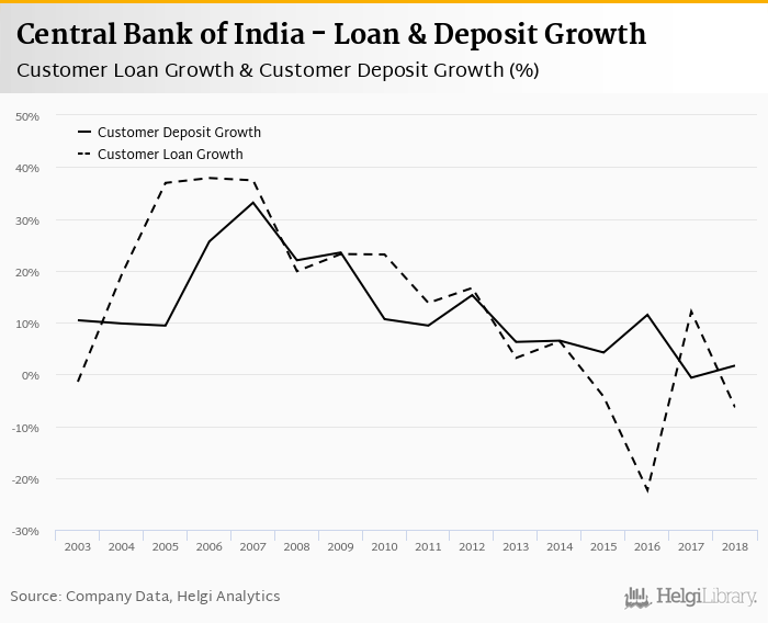 Central Bank of India's customer loan growth reached -6.38% in 2018, down from 12.1% compared to the previous year. Historically, the bank’s loans growth reached an all time high of 37.9% in 2006 and an all time low of -22.4% in 2016. In the last decade, the average annual loan growth amounted to 5.59%.