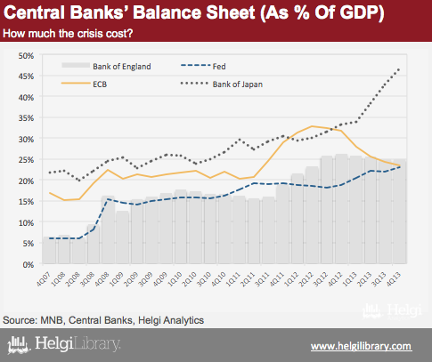 Since the end of 2007, balance sheet of Central banks in the developed countries have expanded heavily as a result of the quantitative easing. While assets of ECB increased by only 6.5% to 23.4% of GDP at the end of 2013, FED and the Bank of England have spent 18.5% and 17.1% of GDP, respectively, to support their economies to total of 23% and 25% of GDP, rspectively. Still, it is the Bank of Japan being the biggest spender here rising its balance sheet assets by a quarter to 46.7% of GDP as of the end of 2013.