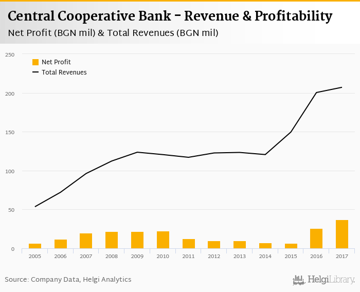 Comparing Central Cooperative Bank with its closest peers, United Bulgarian Bank generated a net profit of BGN -47.4 mil with revenues of BGN 346 mil in 2017, Raiffeisenbank Bulgaria netted BGN 137 mil (revenues of BGN 314 mil) and UniCredit Bulbank announced a net profit of BGN 412 mil (revenues of BGN 868 mil).