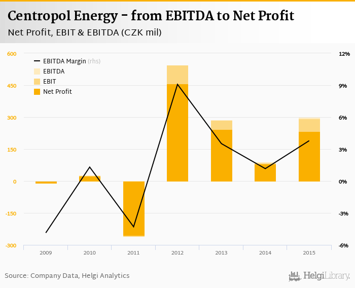 Centropol Energy made a net profit of CZK 234 mil with revenues of CZK 7,934 mil in 2015, up by 186% and up by 2.85%, respectively, compared to the previous year. This translates into a net margin of 2.95%.