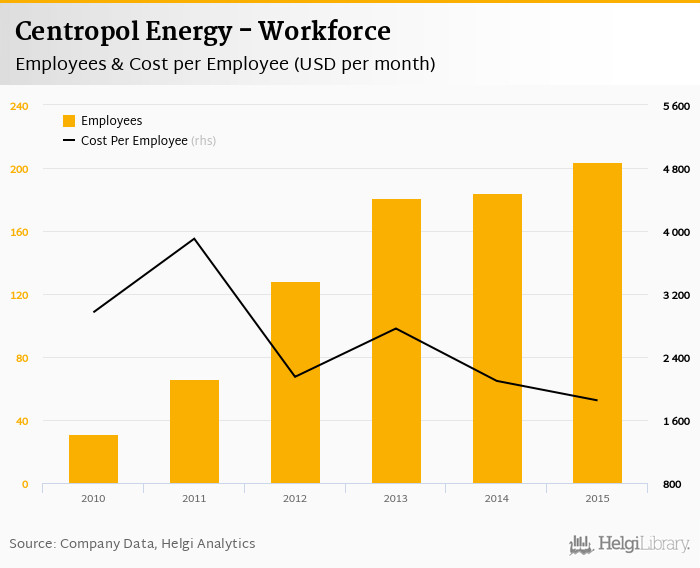 Centropol Energy employed 204 employees in 2015, up 10.9% compared to the previous year. Historically, between 2010 and 2015, the firm's workforce hit a high of 204 employees in 2015 and a low of 31.0 employees in 2010.
