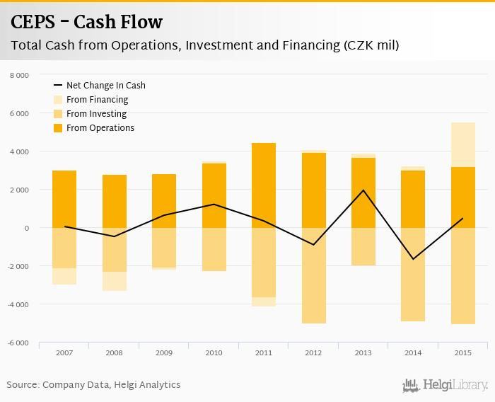 CEPS's operating cash flow stood at CZK 3,176 mil in 2015, up 5.45% when compared to the previous year. Historically, between 2007 - 2015, the firm’s operating cash flow reached a high of CZK 4,443 mil in 2011 and a low of CZK 2,794 mil in 2008.