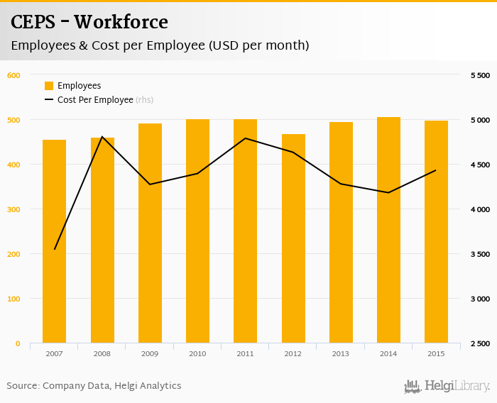 CEPS employed 499 employees in 2015, down 1.38% compared to the previous year. Historically, between 2006 and 2015, the firm's workforce hit a high of 506 employees in 2014 and a low of 420 employees in 2006.