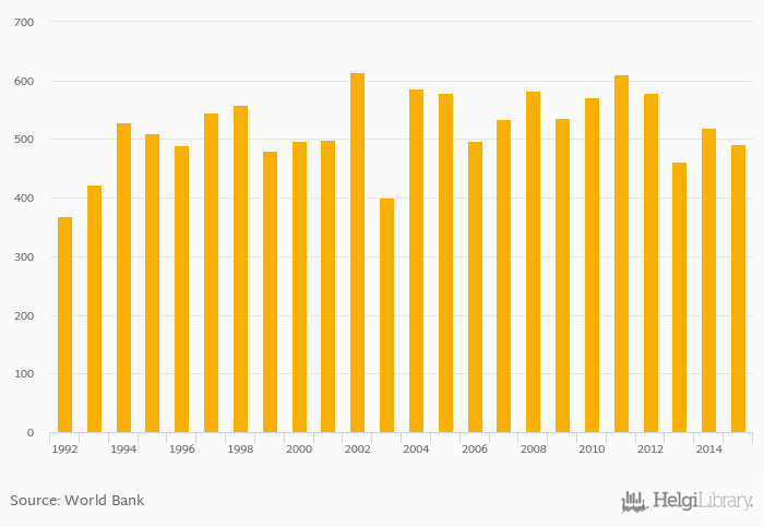 Cereal production fell 5.72% to 491 kt in Slovenia in 2015, according to Faostat.