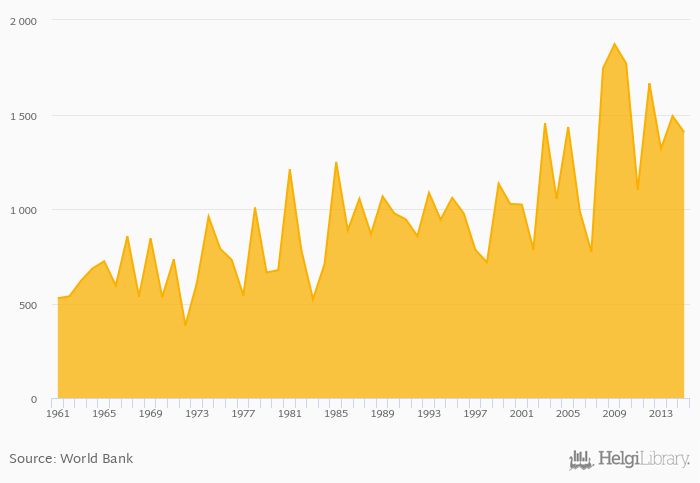 Historically, cereal production in Senegal reached an all time high of 1,872 kt in 2009 and an all time low of 384 kt in 1972. When compared to Senegal's main peers, cereal production in Gambia amounted to 227 kt, 3,367 kt in Guinea, 5,971 kt in Mali and 297 kt in Mauritania in 2015.