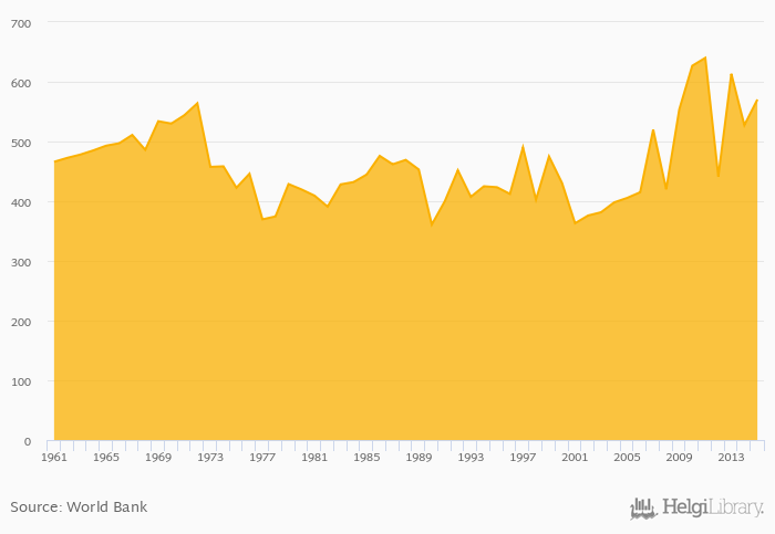 Cereal production rose 8.15% to 570 kt in Haiti in 2015, according to Faostat.