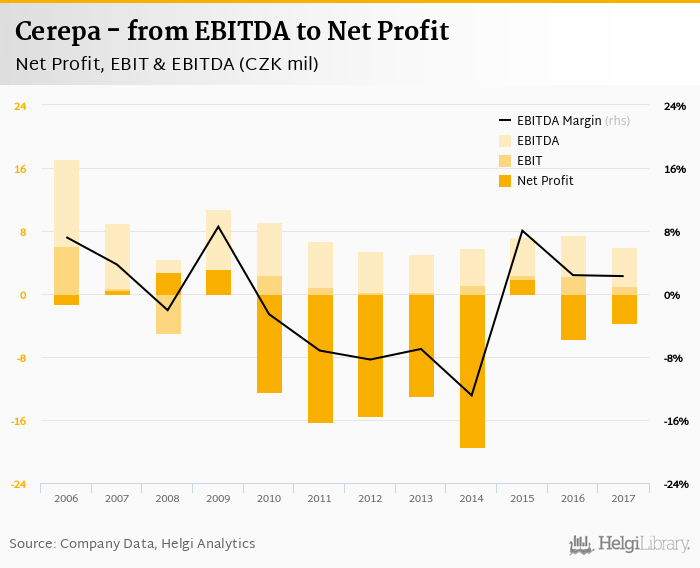 Cerepa made a net profit of CZK -3.71 mil with revenues of CZK 100 mil in 2017, up by 34.8% and up by 32.8%, respectively, compared to the previous year. This translates into a net margin of -3.71%.