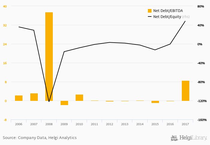 Historically, the firm’s net debt to equity reached a high of 48.4% in 2017 and a low of -123% in 2008 between 2006 and 2017. The average for the last five years was 6.81%.