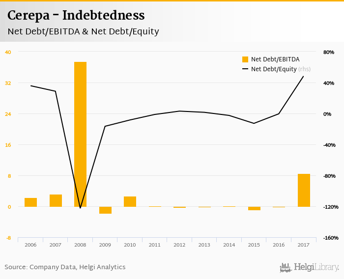 Cerepa's net debt stood at CZK 19.3 mil and accounted for 48.4% of equity at the end of 2017. The ratio is up 48.8 pp compared to the previous year.