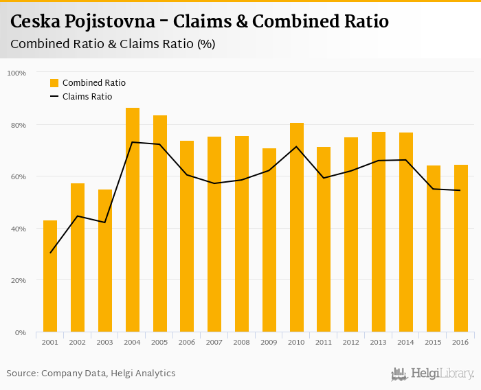 Gross claims reached CZK 11,003 mil in 2016, so average claims ratio amounted to 54.4% in 2016. That is compared to an average 60.7% seen in the last five years.