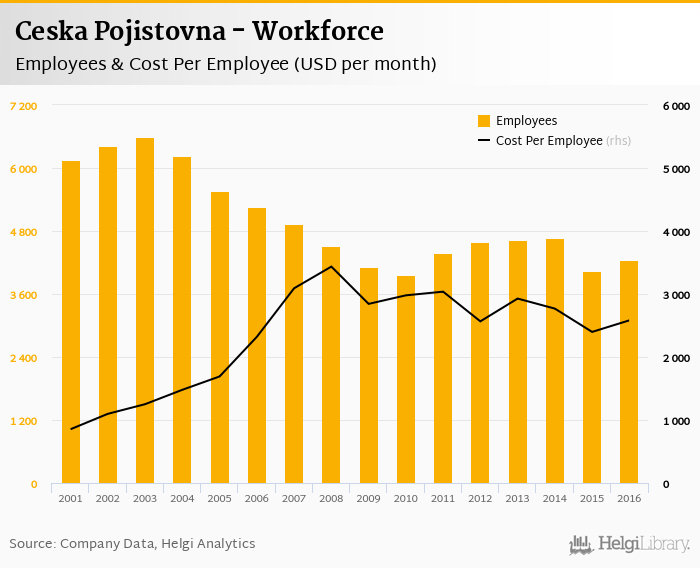 Ceska Pojistovna employed 4,254 persons in 2016, up 5.48% when compared to the previous year. Historically, the firm's workforce hit an all time high of 6,585 persons in 2003 and an all time low of 3,957 in 2010.