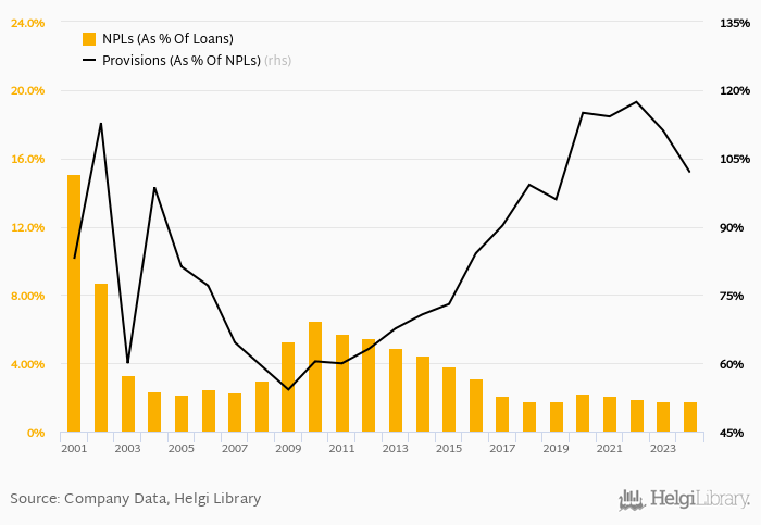 Provision coverage amounted to 102% at the end of 2024, down from 111% compared to a year earlier.