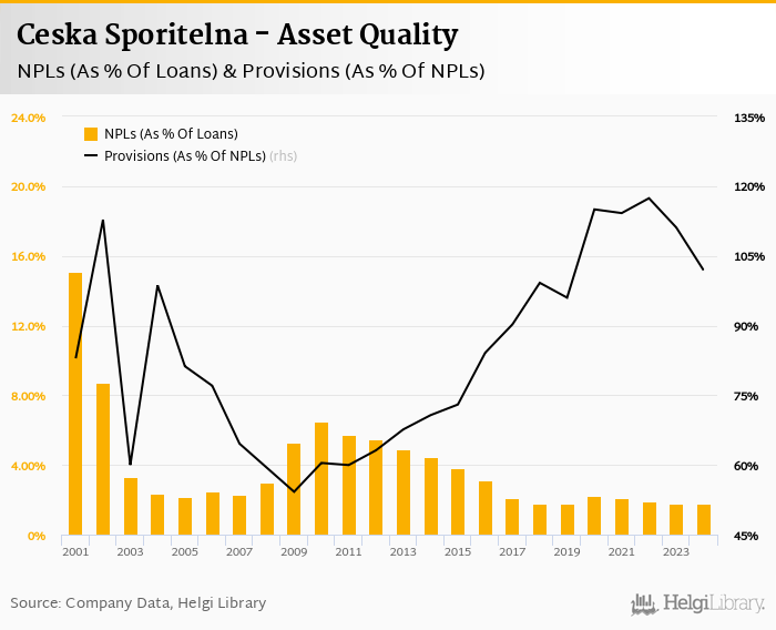 Comparing Ceska Sporitelna with its closest peers, Komercni Banka operated at the end of 2024 with NPL ratio of 1.94% and provision coverage of 44.3%.