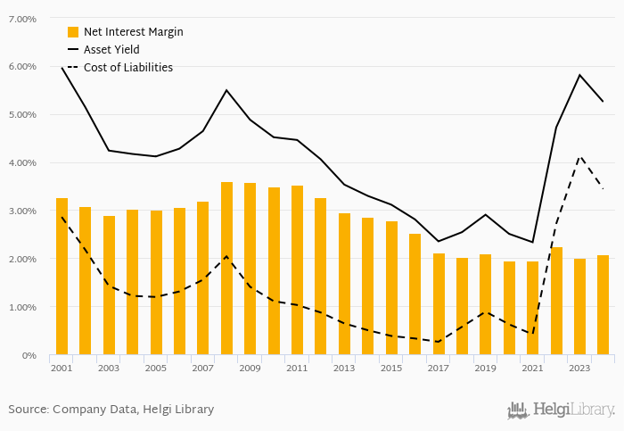 Historically, the bank’s net interest margin reached an all time high of 3.61% in 2008 and an all time low of 1.94% in 2020. The average margin in the last five years amounted to 2.05%.