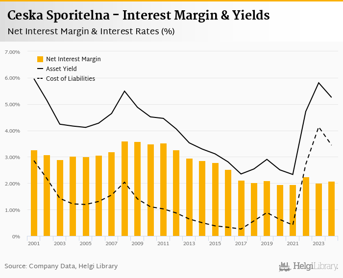 Comparing Ceska Sporitelna with its closest peers, Komercni Banka operated in 2024 with a net interest margin of 1.66% in 2024,.
