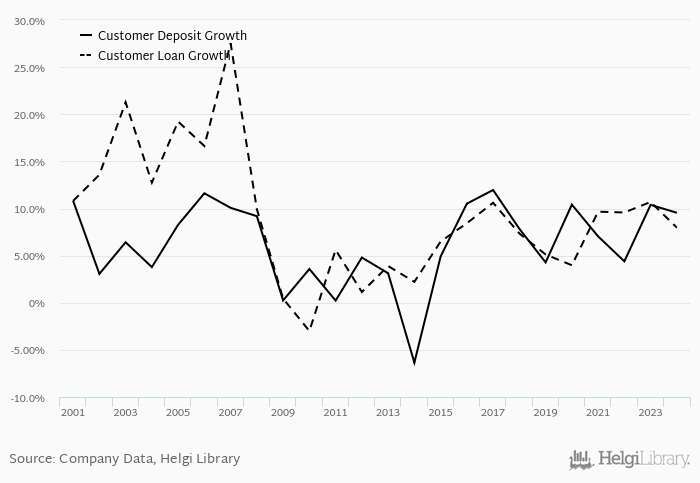 On the other hand, bank's customer deposit growth amounted to 9.54% at the end of 2024, down from 10.4% when compared to the previous year. Historically, the bank’s deposit growth reached an all time high of 12.0% in 2017 and an all time low of -6.35% in 2014. In the last decade, the average annual loan growth amounted to 8.09%.