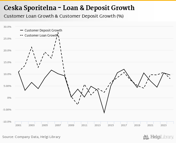 Ceska Sporitelna's customer loan growth reached 7.97% in 2024, down from 10.7% compared to the previous year. Historically, the bank’s loans growth reached an all time high of 27.5% in 2007 and an all time low of -3.00% in 2010. In the last decade, the average annual loan growth amounted to 7.97%.