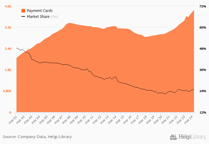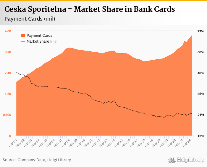 Ceska Sporitelna therefore accounted for 24.6% of all bank cards issued by banks in Czechia at the end of 2024-06-30. Historically, the bank’s market share in payment cards reached an all time high of 48.3% in 2001-03-31 and an all time low of 22.2% in 2020-09-30.