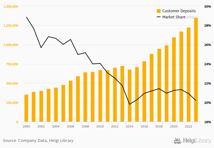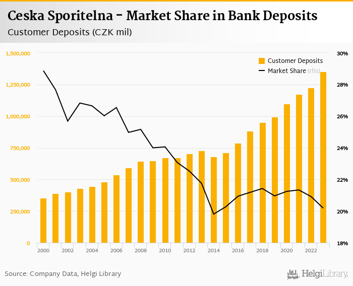 Ceska Sporitelna accounted for 20.2% of all customer deposits taken by banks in Czechia at the end of 2023. Historically, the bank’s market share in customer deposits reached an all time high of 28.9% in 2000 and an all time low of 19.8% in 2014.