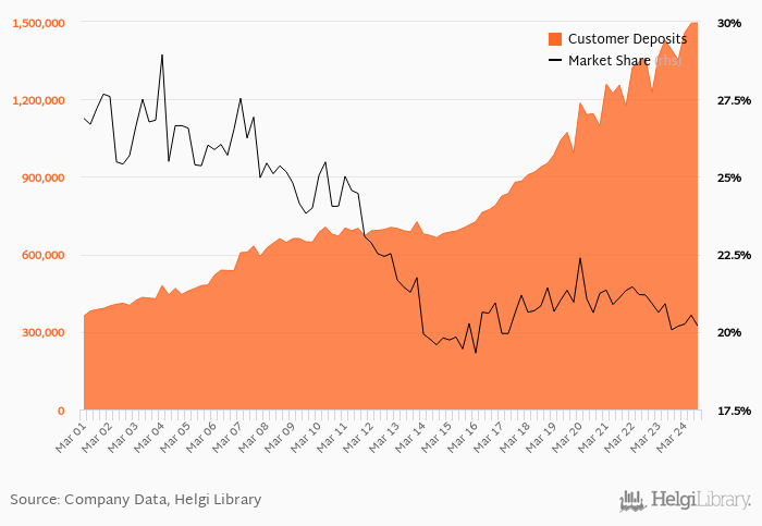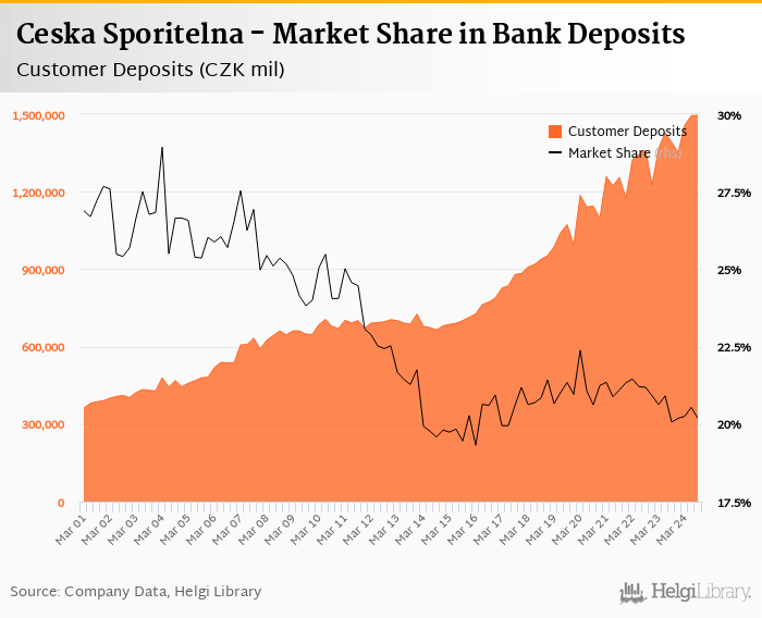Ceska Sporitelna accounted for 20.2% of all customer deposits taken by banks in Czechia at the end of 3Q2024. Historically, the bank’s market share in customer deposits reached an all time high of 28.9% in 1Q2004 and an all time low of 19.3% in 1Q2016.