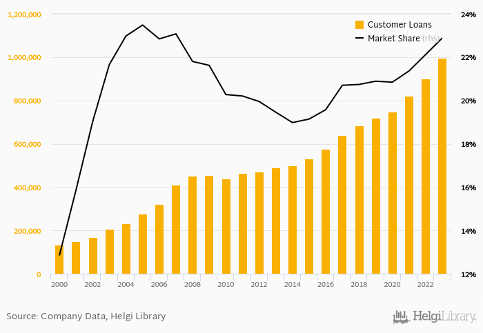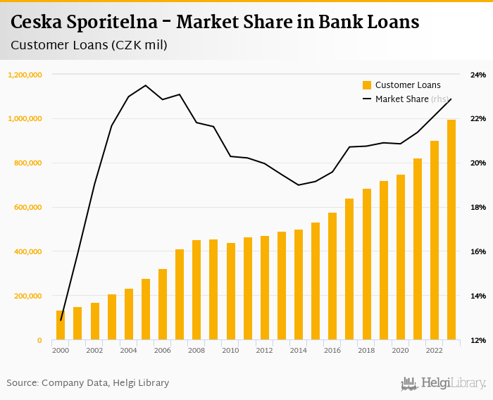 Ceska Sporitelna accounted for 22.9% of all customer loans issued in Czechia at the end of 2023. Historically, the bank’s market share in customer loans reached an all time high of 23.5% in 2005 and an all time low of 12.8% in 2000.