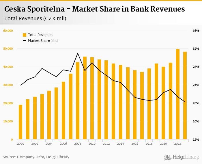 Ceska Sporitelna generated total banking revenues of CZK 48,365 mil in 2023, down 3.03% compared to the previous year.