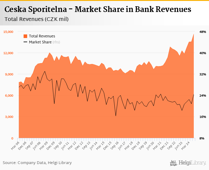 As a result, Ceska Sporitelna accounted for 24.4% of all bank revenues generated by banks in Czechia in 2024-09-30. Historically, the bank’s market share in total revenues reached an all time high of 33.1% in 2008-12-31 and an all time low of 16.3% in 2016-06-30.