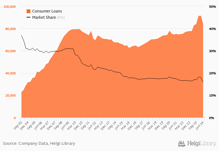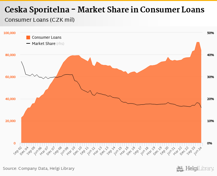 Ceska Sporitelna's consumer loans reached CZK 82,927 mil in 2024-06-30, down 9.11% compared to the previous year.