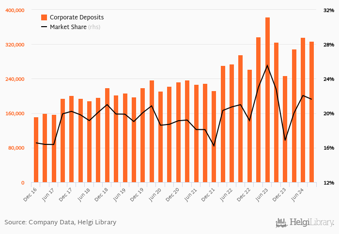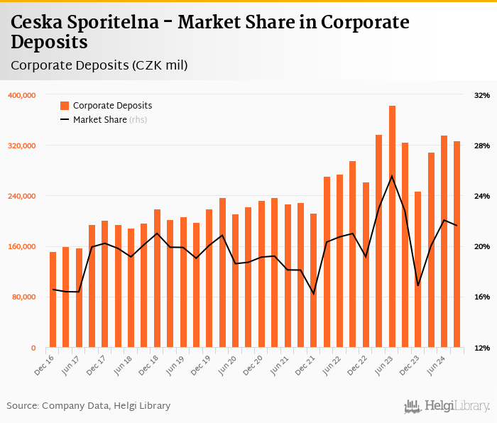 Ceska Sporitelna's corporate deposits reached CZK 327,000 mil in 2024-09-30, down 2.62% compared to the previous year.