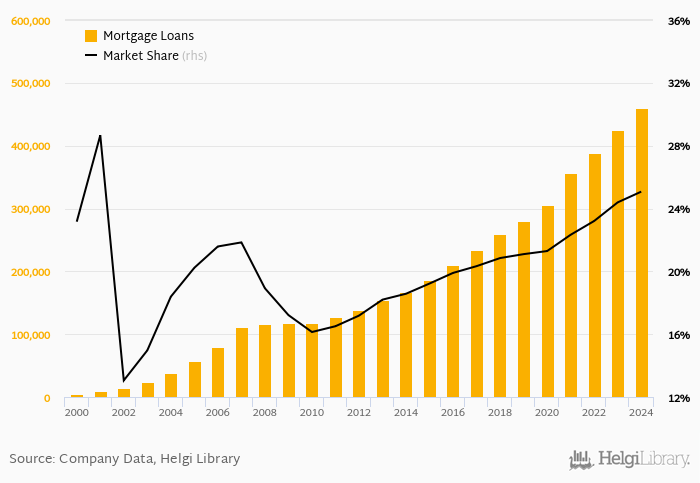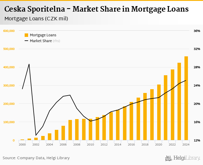 Ceska Sporitelna accounted for 25.1% of all mortgage loans issued in Czechia at the end of 2024. Historically, the bank’s market share in mortgage loans reached an all time high of 28.7% in 2001 and an all time low of 13.1% in 2002.