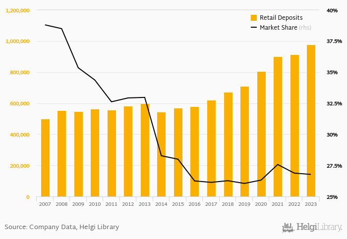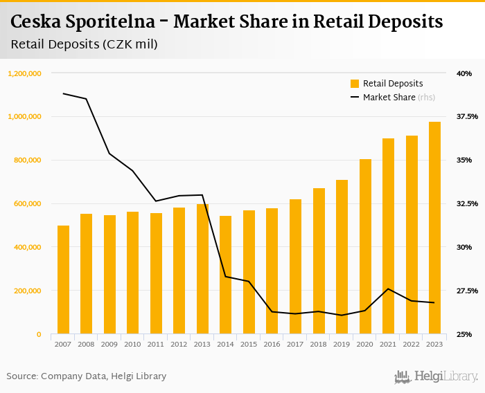 Ceska Sporitelna's retail deposits reached CZK 977,500 mil in 2023, up 7.09% compared to the previous year.