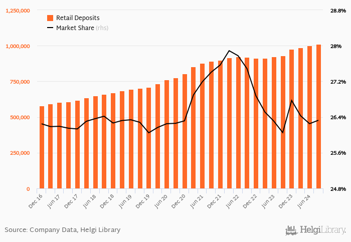 Ceska Sporitelna's retail deposits reached CZK 1,012,500 mil in 2024-09-30, up 1.34% compared to the previous year.