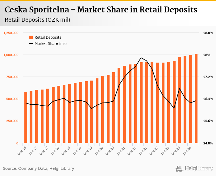 Ceska Sporitelna accounted for 26.3% of all retail deposits taken by banks in Czechia at the end of 2024-09-30. Historically, the bank’s market share in retail deposits reached an all time high of 27.9% in 2022-03-31 and an all time low of 26.0% in 2019-12-31.