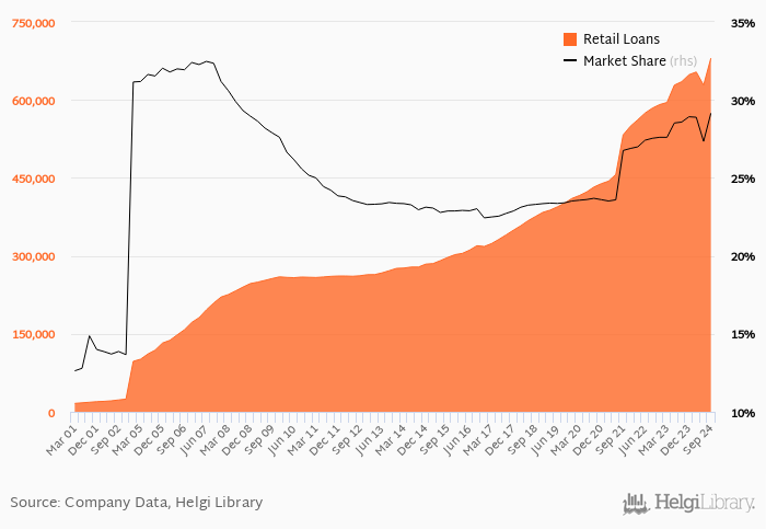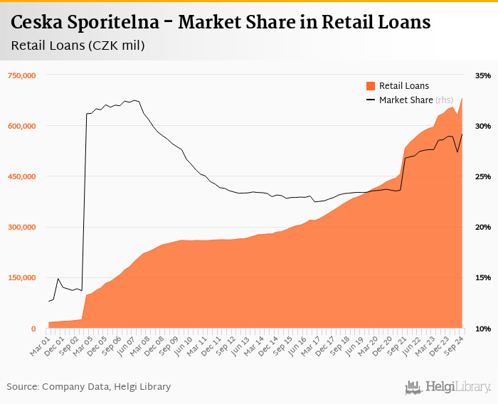Ceska Sporitelna accounted for 29.1% of all retail loans issued in Czechia at the end of 3Q2024. Historically, the bank’s market share in retail loans reached an all time high of 32.5% in 2Q2007 and an all time low of 12.6% in 1Q2001.