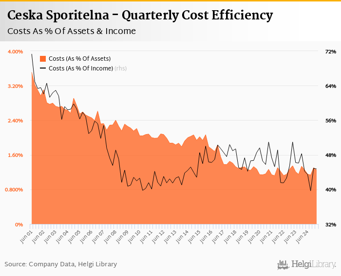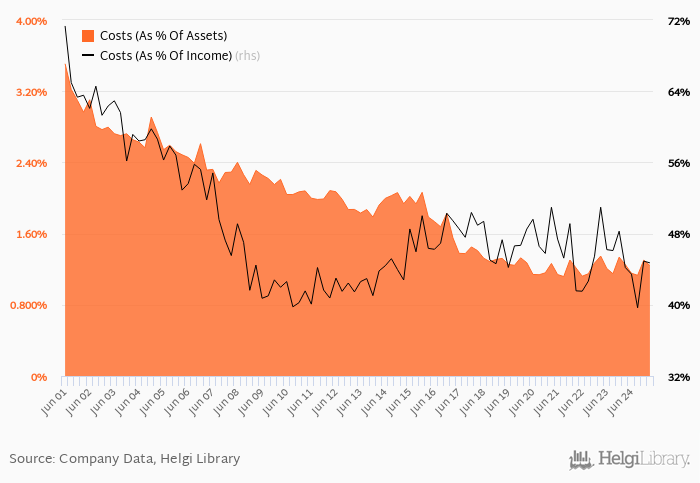 Historically, the bank’s costs reached an all time high of 71.3% of income in 2Q2001 and an all time low of 39.7% in 3Q2024.