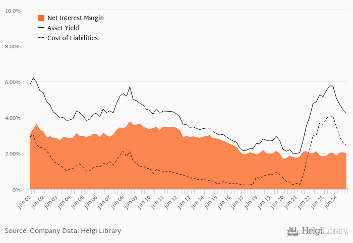 Ceska Sporitelna's net interest margin amounted to 1.98% in the first quarter of 2025, down from 2.04% when compared to the previous quarter.