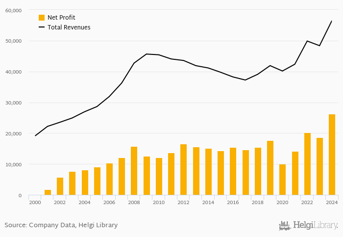 On the other hand, bank’s revenues amounted to an all time high of CZK 56,486 mil in 2024 and an all time low of CZK 19,112 mil in 2000. The average revenues in the last five years reached CZK 47,445 mil.