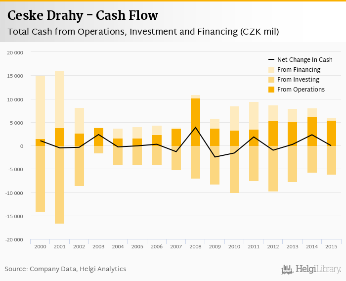 Cash from financing amounted to CZK 669 mil, so the company generated CZK -70.5 mil net cash in 2015.