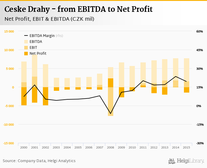 Ceske Drahy made a net profit of CZK -1,402 mil with revenues of CZK 33,083 mil in 2015, down by 1% and up by 0.143%, respectively, compared to the previous year. This translates into a net margin of -4.24%.